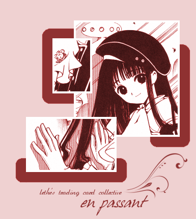 ... to en passant, home to Lethe's trading card collection.I quit TCGs for some time, but now I'm back. <3 The new layout is simple because I was in a rush to get one up and I'm soooo out of it. I'm not that pleased about the lack of colors. @_@ I snagged the random brush from Shizoo. Anyway, it's Tomoyo from Tsubasa: Reservoir Chronicle, originally Card Captor Sakura. It's supposed to reflect me joining Cheer! and anticipating CLAMPaign's return. This page is best viewed in Firefox with a screen resolution of at least 1024x768.